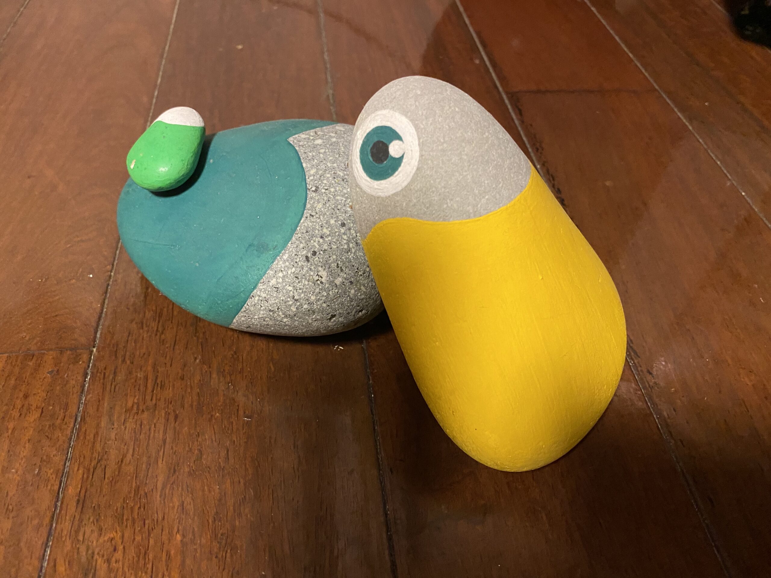 海岸で拾った石にペイントをして作った、一応は鳥のつもりです。