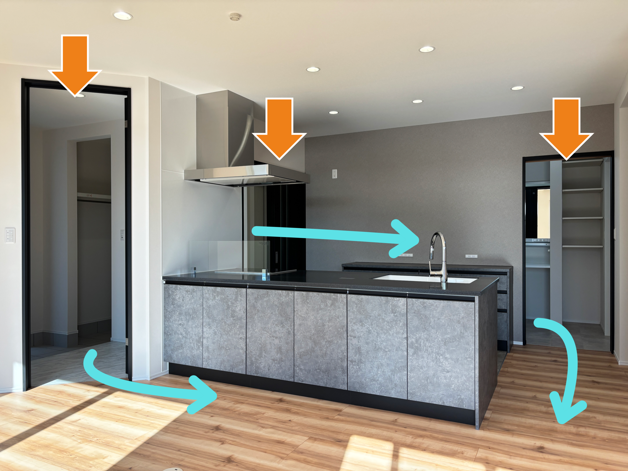 WIC・水回りをぐるっと回れる動線も取り入れており、