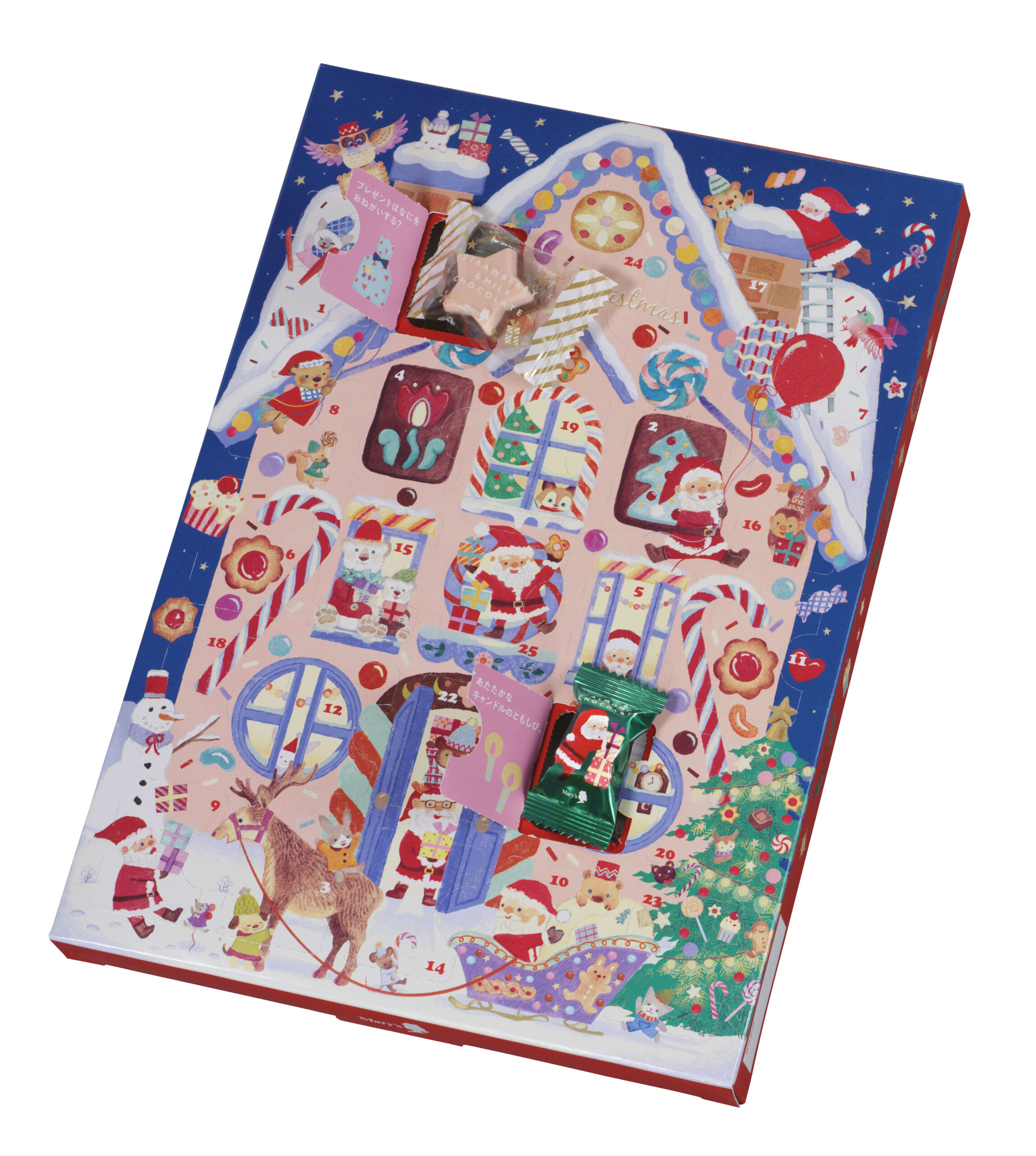 大きなお菓子の家でにぎやかにクリスマスを楽しむサンタさんや動物たちが描かれたアドベントカレンダー。